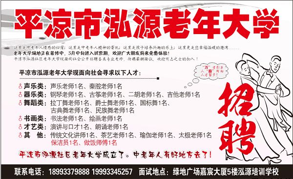 平凉泓源老年大学招聘教师数名